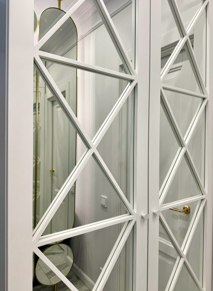 Двери с зеркалами: Шкафы-купе могут иметь двери с зеркальными поверхностями, что делает их функциональными и помогает в оформлении пространства.